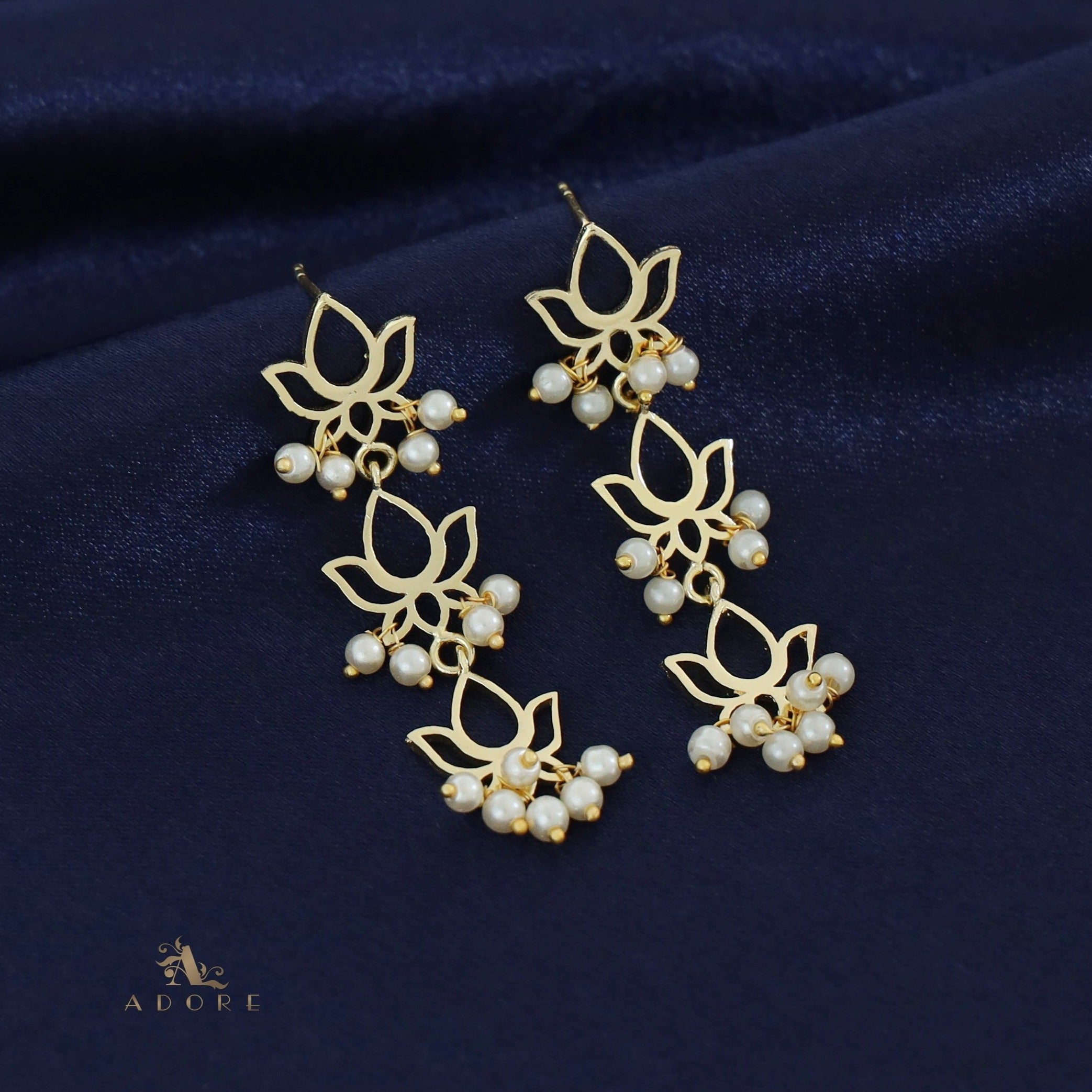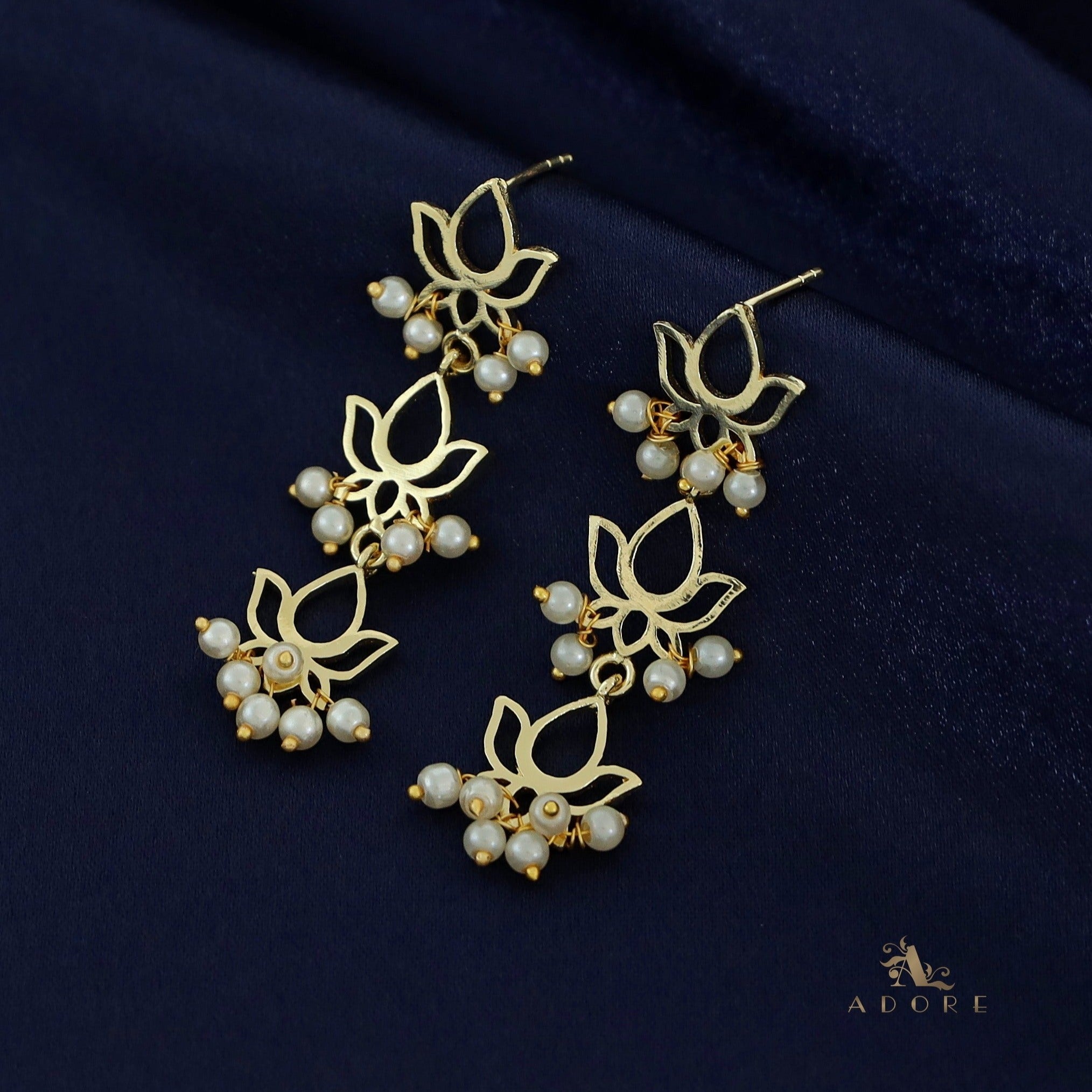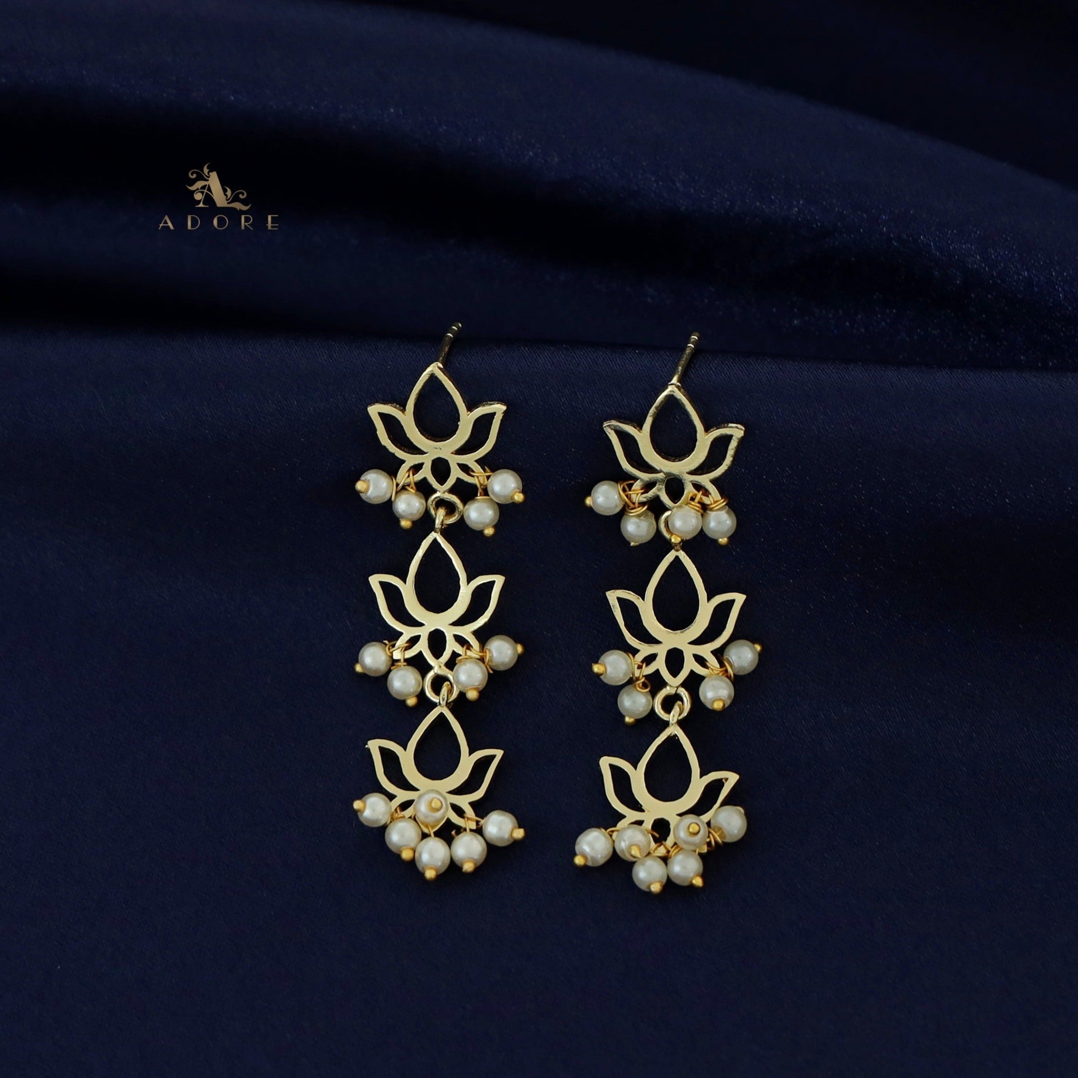 Golden Tri Lotus Pearl Cluster Earring